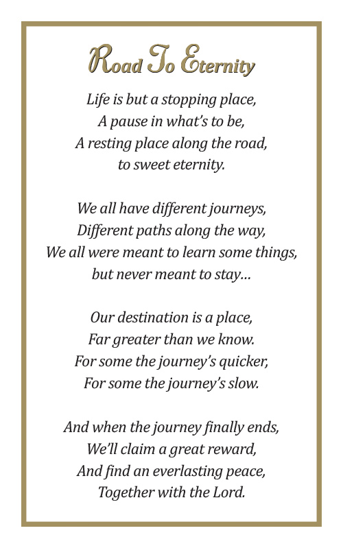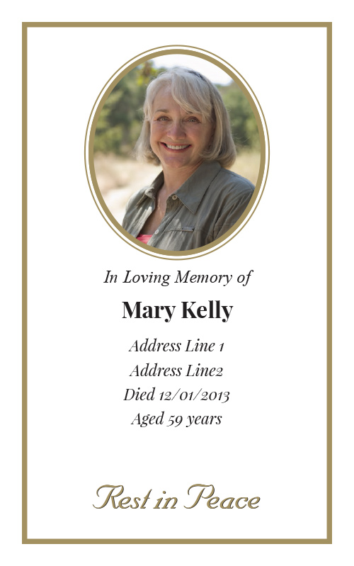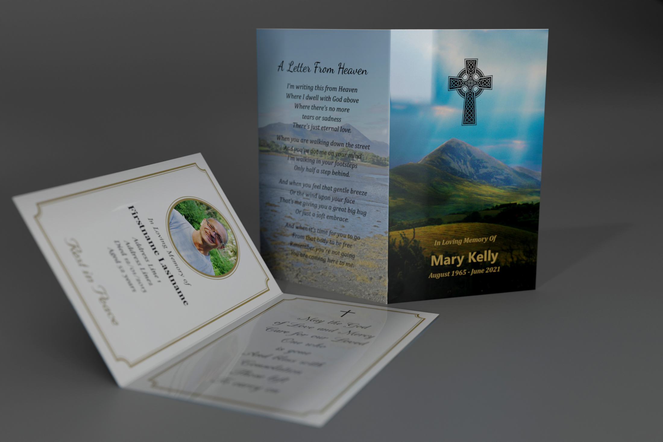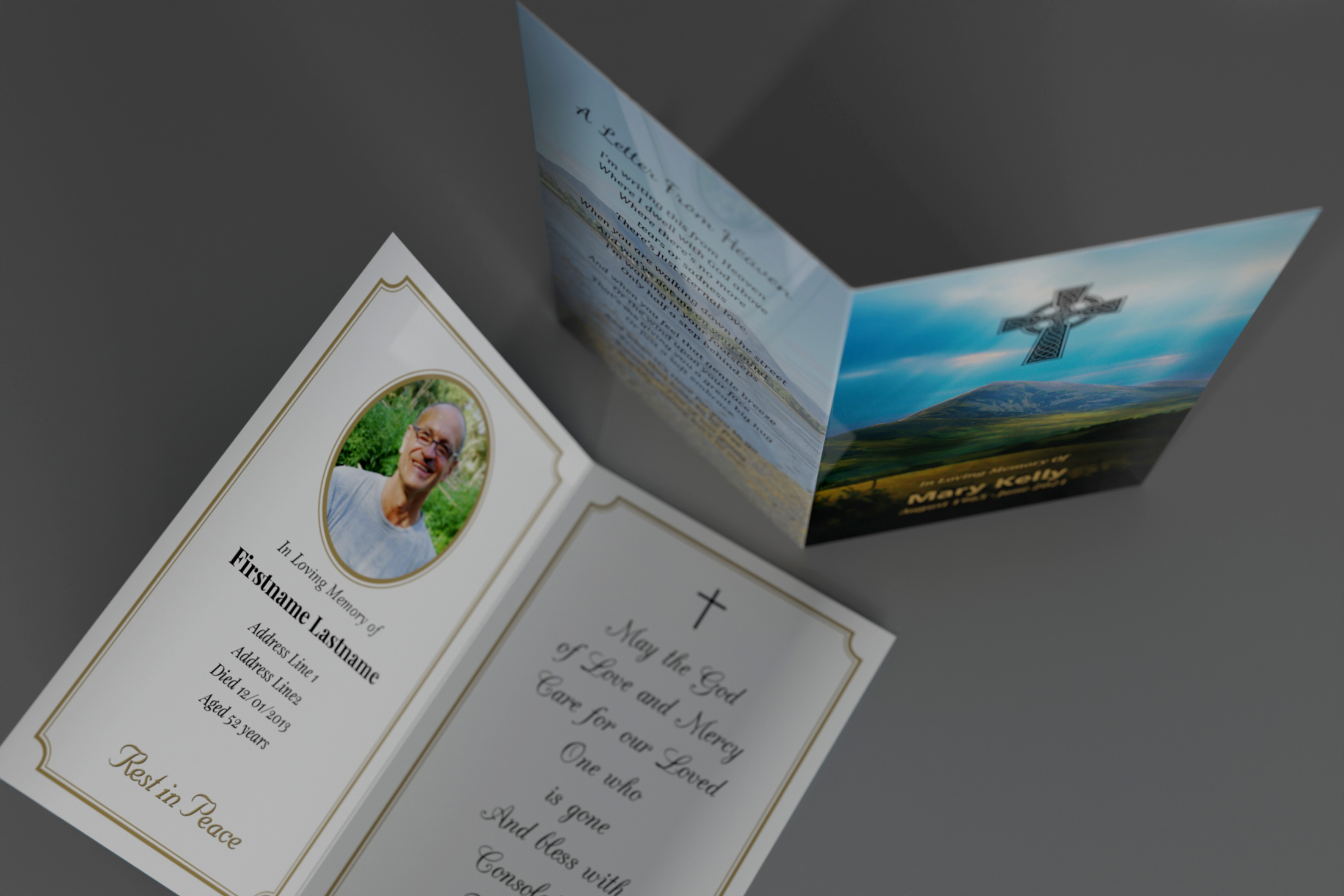 All frames are optional, frame styles inside are selectable. This Memorial Card features selectable (optional) verses for pages 3 and 4, however back can be left with no verse if you want – there is a faded image of Croagh Patrick that will look good on its own too.