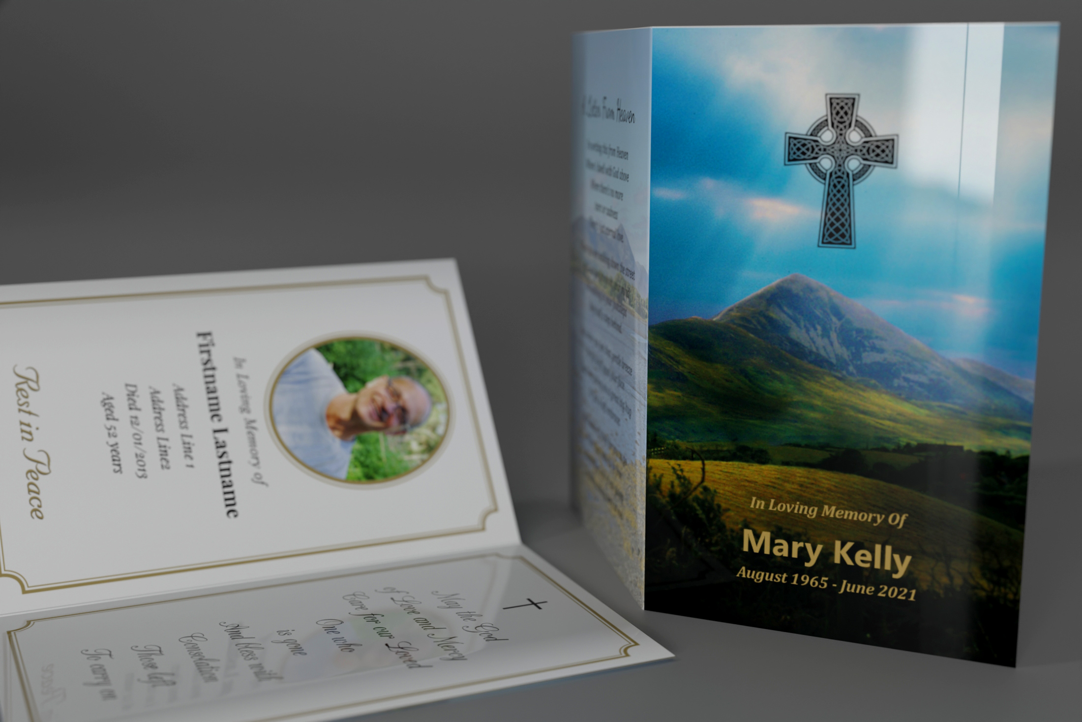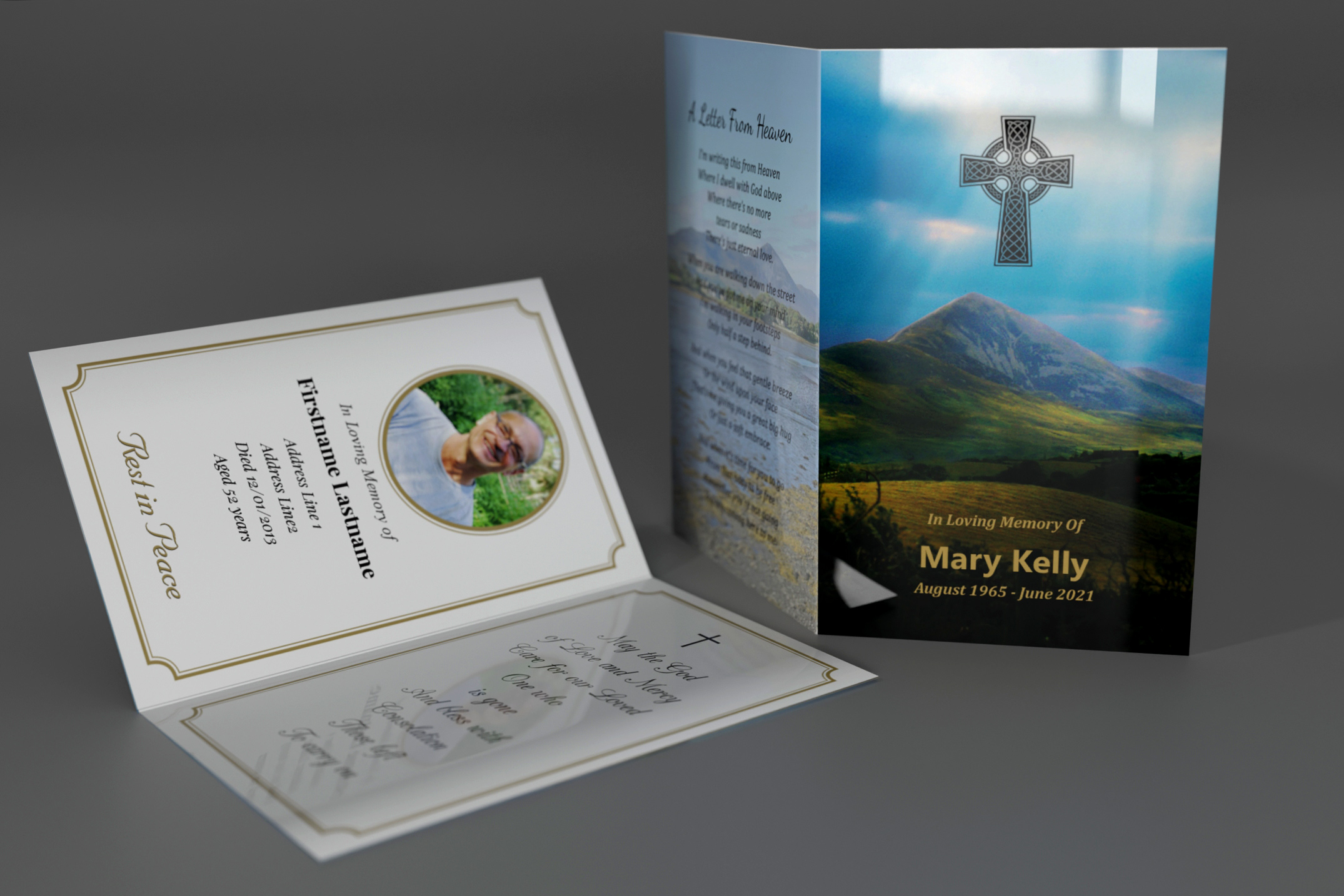 Scenic memorial card with image of Croagh Patrick on the front. On the back there is a view of Croagh Patrick from further way. Photo inside left is optional so you can use this design with one photo or with no photos. Video below shows the layout and some of the verses and frames that can be used for the inside pages: